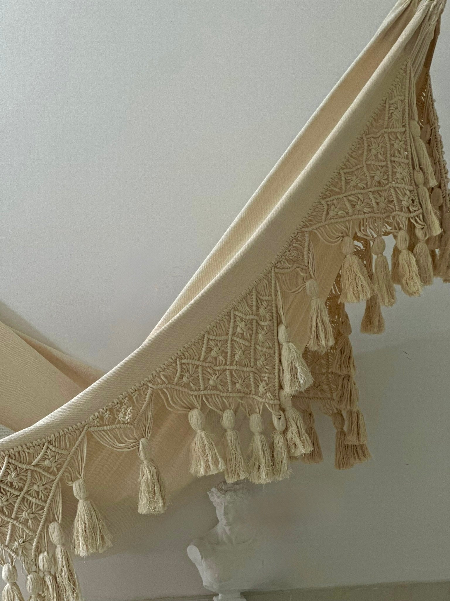 - Color: El tono crudo corresponde al color natural del algodón sin tintes. Si deseas personalizar tu hamaca con otros colores, no dudes en escribirnos por WhatsApp.